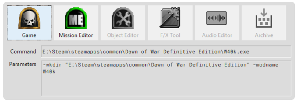 The Game tool button launches Warhammer® 40,000: Dawn of War® Definitive Edition so as to automatically load the selected mod.