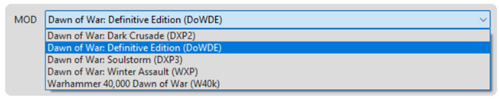 The MOD drop-down shows all of the MODs available to the Warhammer® 40,000: Dawn of War® Definitive Edition.