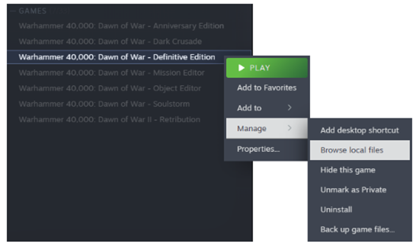 In your Steam Library, right-click on Warhammer 40,000: Dawn of War - Definitive Edition and navigate to Manage → Browse local files.